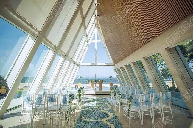 钻石殿堂,原来比想象中更加庄重神圣! 仪式堂正面呈三角形,四面玻璃墙环绕,通体如同钻石般棱角分明,晶莹剔透。 阳光在屋顶与墙壁间折射,让现场如璀璨梦境般绚烂。 浪漫又圣洁,有着庄严的仪式感与艺术情怀。