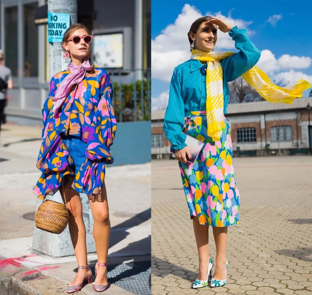 容易出错的鲜艳花色,反而是 Jenny 搭配的拿手好戏,只要选择花色中的主要色彩作为全身另一件的主色调,整体颜色不跳脱花色的范围,就能达到和谐的视觉效果。