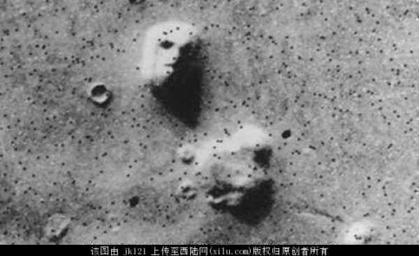 照片中可看出一张类似人的脸庞平铺在火星表面上。有人猜测,这幅人脸是外星人在火星上建造的纪念碑。