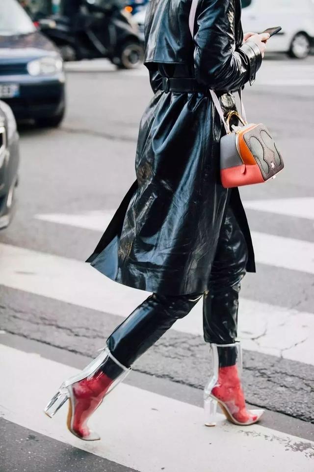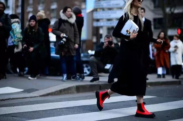 黑色还有个好处,当它与其他颜色碰撞的时候,会让颜色更加突出。在all-in-black的造型中加入一点亮色,会比全身花花绿绿来得更显眼,也更高级,第一招——可以学着利用包包、鞋子作为点睛之笔。
