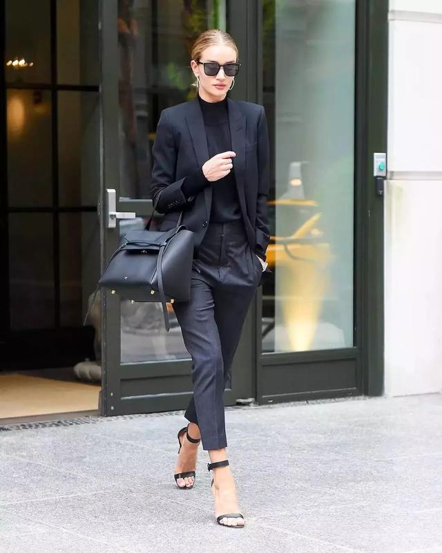 Rosie Huntington-Whiteley也经常提Céline的手袋,这是她的全黑造型搭配黑色Belt手袋。