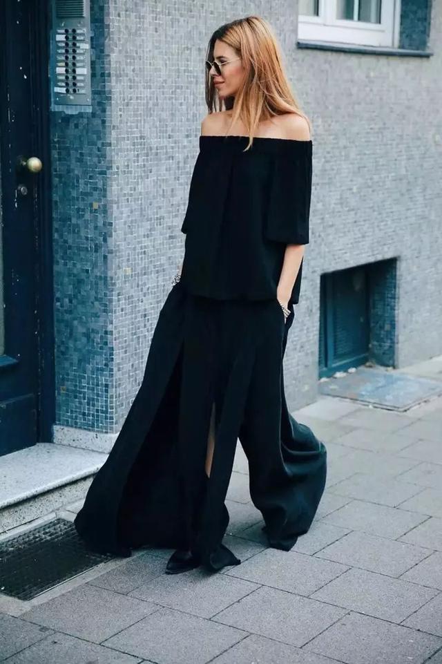 今年非常流行的一字领设计也可以入手,恰到好处地给了大面积的黑色喘息的空间。