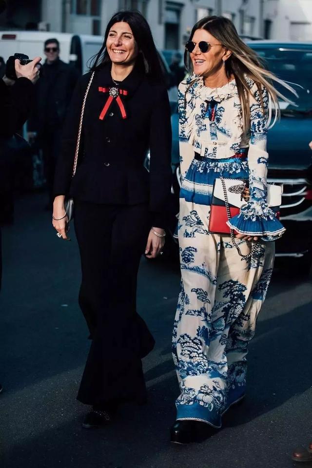 因为衣服复古而独特的廓形感,就算是全黑造型,Giovanna Engelbert完全不输站在旁边满身印花的Anna Dello Russo。