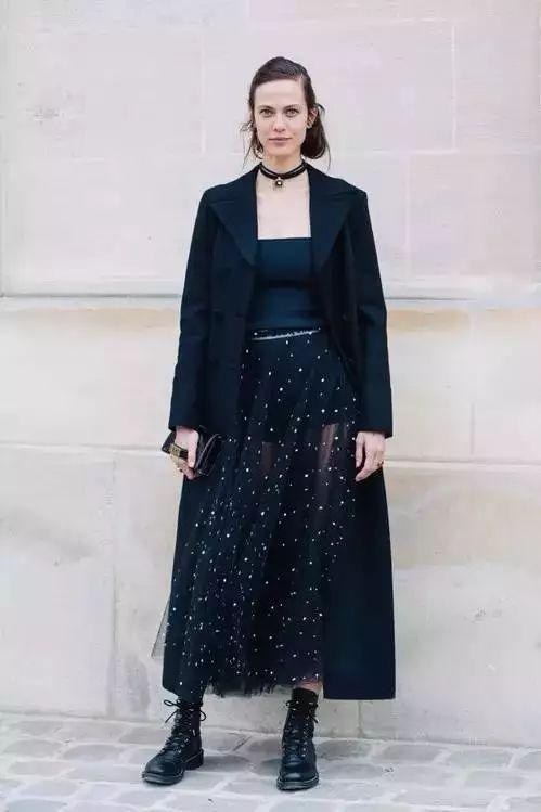 Aymeline Valade的look也是本季最流行的穿法,柔美的黑色纱裙搭配硬挺的大衣或西装,有一种反差美。