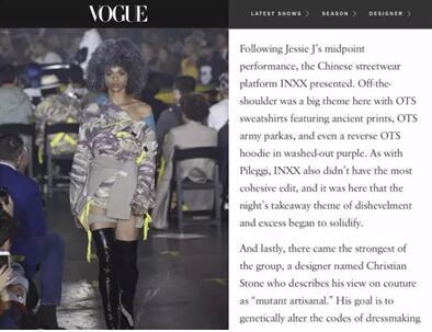 在今年纽约时装周的现场,新生的中国潮流力量成为一个极大的亮点,而 INXX 亦曾受国际首席时尚媒体 VFLIES 邀约,在去年就已成功登陆纽约时装周。 在 INXX 2018 S/S 纽约时装周大秀现场,INXX 将属于中国传统文化体系的禅学与现代先锋潮流元素糅合再造,在世界时尚中心昭示自成一体的中国新潮流的诞生。 秀场上的每一件时装都带着 INXX 烙印的内置身份,共同搭建出一个强大的“磁场”,带来从始至终的情绪附着。 INXX 2018 S/S 纽约时装周秀场 INXX 的这场首秀获得了各大外媒的头条报道与关注,就连时尚圣经 VOGUE 与 i-D 都对 INXX 不乏溢美之词。同时权威杂志 DAZED 与潮流媒体 VFILES 都第一时间报道了 INXX 在纽约的大秀实况,并赞赏有加。 时尚圣经 VOGUE 与全球最有影响力的时尚杂志之一 i-D 缘由于此,在今年的 2018 A/W 纽约时装周期间,INXX 有幸再度受邀前往现场,参加由 VFILES 呈现,ADIDAS 强势助力的“Be Heard,Make Noise”全新时尚体验 Show。 时尚权威 Dazed 与国际首席潮流媒体VFILES 值得一说的是,VOGUE 曾建议 VFILES 用一场盛大派对来代替走秀这种传统模式,此举也催生了这场全新体验 Show 的呈现。 时尚之声的新诠释 这场活动被命名为“Be Heard.Make Noise”,现场气氛就像主题形容的那样绝对热烈,名人大咖与受邀人纷纷现身助力,现场一时无空。 Be Heard.Make Noise 现场 包括 Joey Badass,Slick Woods 和 Sasha Lane 等名人都来到现场,不仅如此,伴随着 DJ GIANNI LEE 发起的刮碟音爆和说唱歌手 BLAKIE 的高热演绎,现场气氛瞬间攀升至顶点。 GIANNI LEE BLAKIE BALI BABY 的演出同样震撼全场,随后,年仅19岁的说唱歌手 COMETHAZINE 更是表现出超脱年龄的舞台掌控力,感染了现场的每个人,让这场盛会的热力一直延烧至午夜。 K RIZZ BALI BABY COMETHAZINE 最后,Soundcloud 的说唱歌手 Smokepurpp 带来了精彩的压轴演出,在他的坚持下舞台关闭了灯光,他也在黑暗中带来了有趣的演出效果。 独树一帜的时尚环节 当晚的时尚部分同样独具匠心,VFILES 特地在舞台上设立了一个摄影工作室,他们把时装秀的后台,甚至化妆间和造型间都一并呈现到大众面前。 摄影师 Christelle de Castro 和造型师 Anna Trevelyan 进行拍摄的同时也为我们带来了不少个性十足的造型设计,部分模特服装也由INXX呈现。 YOUNG THUG ANTEUS BABY BLUE CHEEKY MA 现场模特们还穿着 VFILES Runway 获奖者的作品在秀场穿行,我们亦在现场看到了众多 Instagram 上的网红与 KOL 现身,可谓收获颇丰。 CLERMONT TWINS AND DUSTY 当然,这场 Show 的意义并不仅仅就此而已,它打破了传统的秀场演绎,连带 VFILES 与 ADIDAS 等品牌将其以主题的形式呈现,成为了结合品牌好友、音乐人表演等环节为一体的“盛宴性”发布会。 即使目前来看是仍是小小的一步,但无疑给我们奉献了诸多意义深远的细节,更值得推崇的是这一步全然由惯性趋引,没有半点牵强,从而发出真正属于青年文化体系的时尚之声。 南通0 |