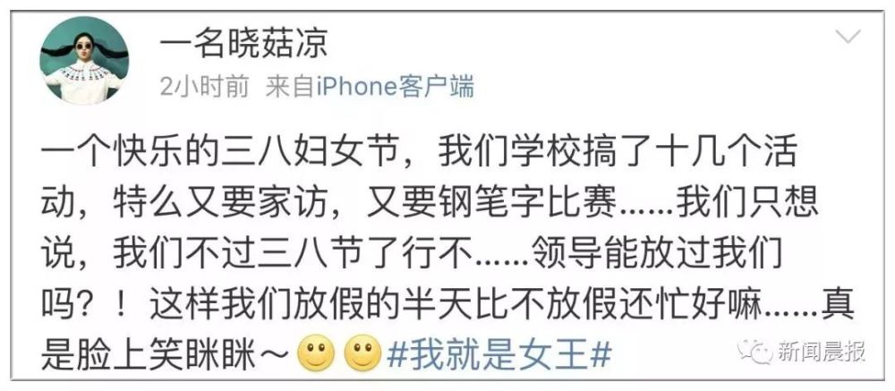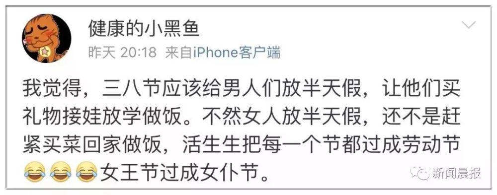 @邢彩琳:没想到公司一直惦记女员工们的福利,给十几名女员工每人送了一束花,这可比自己爱人、朋友送的花更让人感到温馨。 相比于各种实物现金福利 网友表示更期待假期 也有人抱怨:这些都是别人家的公司, 我们公司在这一天还要求加班到十点; @请叫我开心:不要求公司发三八节的鬼礼物,只希望少加班!