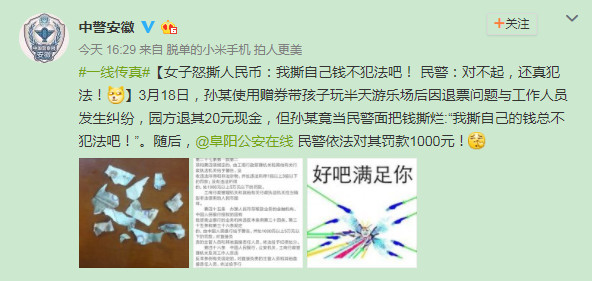 女子怒撕20元人民币被罚1000元:撕自己钱不犯法吧 |