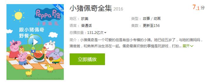 温和但有观点,小猪佩奇赢得了全球孩子和家长的心其实,在成年人之前,小猪佩奇在孩子们中间已经流行好几年了,并且可以说是一部非常优秀的儿童动画片。 2004年5月31日,《小猪佩奇》的第一集《泥坑》在英国“第五频道”播出,故事围绕她与家人的愉快经历,藉此宣扬传统家庭观念与友情,并从此拉开了这只粉红色小猪风靡全球的序幕。 尽管一些中国孩子通过DVD、网络下载等方式也在观看这部动画片,但绝大多数孩子直至11年后才正式接触到这只粉红色的小猪。2015年8月,央视少儿频道引进并播出小猪,并早上七点时段收视率第一的动画片节目。同年,《小猪佩奇》在国内视频网站上线,年播放量突破百亿。 在视频网站爱奇艺上,《小猪佩奇》动画片累计的播放量达到131.2亿次