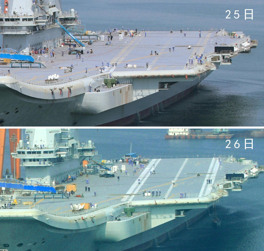 自从我国首艘国产航母在23号进行了倾斜试验以来,这几日大连船厂附近人气攀升,航母成了人们关注的绝对焦点,何时启航也成了时下热议的话题。航母的甲板已经完全被清空,施工时的杂乱布置一扫而空,斜角甲板上最醒目的左右两道白色着舰引导线在25日重新开始涂刷,就在今日,仅仅一天时间,数百米长的线就完成了涂刷工作,再次体现了我航母工程的高效工作。