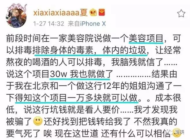 这几天所长收到后台宝宝投稿,网红夏夏花了30W给身体排毒的料。