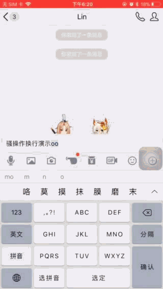 QQ、微信打字换行 对于许多喜欢在聊天软件上撩妹的朋友,在用苹果手机时可能会遇到一些麻烦。在QQ聊天界面,当你想到一个绝佳的段子,为了让段子更具生动性需要换行编辑时,你却无从下手,因为我们常见的苹果手机换行按键不见踪影。剩下的只是一个显赫的发送按钮。对于这一简单的换行操作,我们应该怎么做到呢? 有的用户表示用把需要的字打满之后,后面就用空格键,空格键一直把第一行填完,到第二行打字的时候就实现了自动换行的目的,不过在亲身试验之后,空格键持续按到最后,要花费很长时间而且操作起来十分不便,你的聊天内容没有发送过去,估计对方的头像都已经黑了。 还有一种方法是点击输入法上面的语音图标,进入语音输入。然后喊出换行,这时输入栏就显示出了换行后的模样。虽然使用起来十分炫酷,但要讲便捷性还是会差很多。