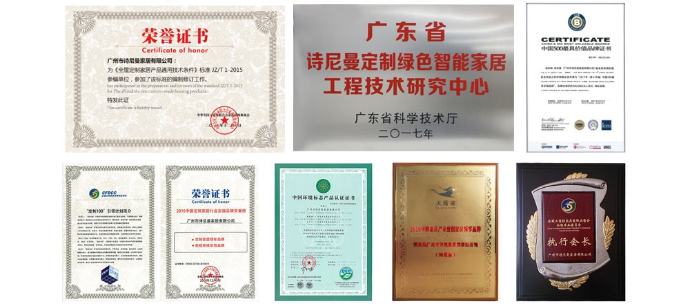 诗尼曼引进德国豪迈生产线,并在广东广州和湖北荆门布局千余亩智能生产基地。与此同时,全国品牌专卖店超千家,覆盖30余省、市、自治区,连续十余年保持超70%的盈利增长,2017年以42.58亿品牌价值入榜中国500最具价值品牌。 品牌荣誉 荣誉源自实力,用心铸就辉煌。诗尼曼深耕定制15年,深受市场肯定,作为全国工商联定制家居专委会执行会长单位,曾参与编制《全屋定制家居产品通用技术条件》标准,被认定为“高新技术企业”、“广东省著名商标”、“广州市著名商标”、“广东省诗尼曼定制绿色智能家居工程技术研究中心”,先后获得“大雁奖”、“中国门窗行业金奖”、“低碳环保示范品牌”、“番禺高成长企业三十强”、“番禺区先进制造业五十强企业”“消费者喜爱品牌”等多项荣誉。