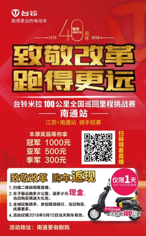 1.里程挑战赛将全程直播,可识别图中二维码观看 2.活动当天,骑多少公里,返多少元现金,当日购买再送大礼包一份 3.全城征集骑手,参加现场骑行,当日购买,优惠更多 4.活动当天购买台铃电动车,享更多优惠 注:活动仅限2018年9月15日当天购车有效 活动热线:15240558999 王先生
