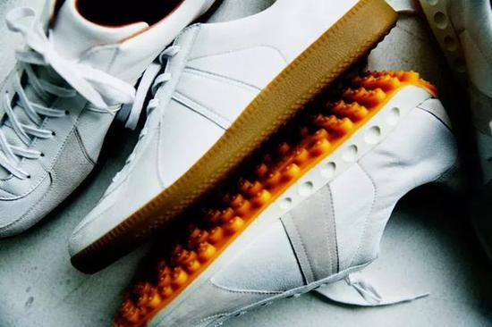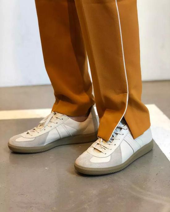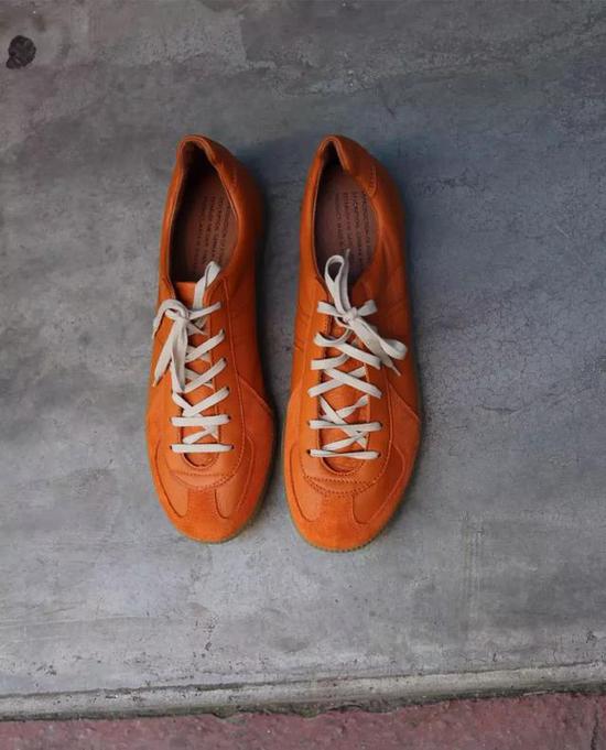 多元的配色也是少不了,叶子个人就被这双橙色的 German Trainer 给迷住了,皮革加绒面两种不同质地,让纯色鞋身有了明显变化,而加入“ 发黄 ”的米白色鞋带,复古的旧感凸显出橙色的色泽来,分外养眼。