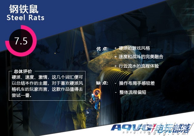 横板卷轴这一类型对于目前的游戏形式而言已经是一种司空见惯的形式,简单直接的战斗也让这种类型稳稳地占据了自己的一席之地,伴随着玩家逐渐对于游戏要求的提高,不同的制作组也在原有的传统横板概念上进行了强化并加入一些自己的心思和想法,这也让横版卷轴这一形式逐渐地百花齐放起来,很明显的是一味地延续传统已经不能够满足如今的游戏市场,而今天评测的这款《钢铁鼠》就是在传统横板竞速模式上进行了自己风格的改进,那么这款作品素质如何,本文将简单对本作内容进行评测。 钢铁鼠丨Steel Rats 开发商:Tate Multimedia 发行商:3goo 发售日期:2018年11月29日 发行平台:PS4 属性:横版、动作、战斗 正如其名一样,《钢铁鼠》在场景上凸显了一种钢铁与复古风格的融合,流程通篇充满了一种蒸汽朋克的元素,游戏选择了一个后启示录的世界观,以50年代的美国复古风格进行了创作,背景中科技止步于1940年代,机械军队大肆入侵,一时间占据了人类的所有城市,略显阴暗的背景搭配了十分硬派的摇滚BGM使得整体都有一种天马行空的艺术感,硬派、暴力、朋克等元素的契合度在这款作品中也得到了十分优秀的表现,这也让游戏全篇的流程都可以让玩家血脉偾张。 尽管机车在游戏中占据了十分重要的位置,但制作组并没有延续机车类作品常规使用的竞速形式,转而将其和平台跳跃、动作、战斗等内容进行了结合,《钢铁鼠》中最大的主角应该就是机车所彰显的夸张暴力美,借由故事主题的设定,主角们的座驾都是经过了强化改装,玩家可以驾驭着他们驰骋在游戏各个关卡的大街小巷,再通过安装在机车上大大小小的战斗部件对关卡中的敌人进行破坏。 但在尺度上本作也并没有太过于激进,如前文所提,游戏中的敌人都是常规的机械部队,因此与暴力相互辉映的断肢飙血的设定在本作中并不会出现,转而是一种金属之间相互的碰撞,火花、爆炸等内容的相互呼应在游戏的通篇流程中展现得淋漓尽致,除了敌人以外,游戏中的大量场景都是可以进行破坏的,从常规的路障到路上随处可见的管道再到废弃在里边的车辆等,通过加速自身的机车切割开眼前的一切,对于喜爱在速度中寻求着暴力美的玩家而言,这样的设定着实可以带来的最大的满足感。 除去简单直接的暴力美,制作组还将“动作”这一概念与机车进行了一次大胆的融合,尽管在公布之初我们并不知道本作会带给我们怎样的结果,但在体验过后可以感觉到这样的融合也为整体的内容增色不少。本作在内容上运用了大多数横板动作游戏的那种“易于上手难于精通”的方式,在刚接触到这款作品时游戏并不会展现太多内容,但伴随着流程的深入更多相对考验操作的形式便会逐一展现出来。配合机车这一主题,游戏在场景的设定上设计得十分开放,在不同的场景中几乎都存在着多个阶级、层数和通路等概念,其中平台直接都以不同的道路相互连接,这些连接的通路往往显得特别“诡异”却又可以给玩家带来一种别样的流畅感。基于多层级的设定,游戏的场景也存在着纵向的行动方式(有些类似大多数街机作品),不同的场景搭配了不同的障碍物和通路,也让整体显得更加具有可变性。 尽管在这本作中制作组舍弃了“速度竞技”的概念,但既然主角是摩托机车,那么速度感也是不能回避的需求,为了突显游戏中机车的速度感,制作组的将每一关得地图都做成了一条完整的赛道,其中一些在机车类作品中常规出现的斜坡、弯道、坑洼等地形全部都有所保留,对于曾一手打造了《自由城市狂飙》的 Tate Multimedia 而言,体现出速度感显然也不是什么难事,在本作中一些摩托机车类型抬头、急转、空翻等常规性动作都得到了保留,并且通过“电锯前轮”的设定可以搭配出各式各样不同的华丽组合技,而对机车的契合也融入了本作的各个角落,甚至解谜和开关环节都是要依靠机车进行。战斗方面也显得十分硬派,除去对自身机车的改造加强外,游戏中还存在着诸如枪械、人物技能等其他战斗要素,当完整了解游戏中的各个内容、技能和效果之后,玩家所要做的便是熟悉挑战管家的路线,搭配好自己擅长的人物技能,拾取武器一路过关斩将,每一种搭配都有不同的战斗可行性,配合相对丰富的技能和改造,也让这款作品拥有了大量的可能性。 游戏开篇首先便是让玩家去找到自己的几名同伴,当逐一发现并获得这些同伴后,便可以在流程中自由切换,人物角色也是游戏中一个重要的环节,每个角色都对应了一种不同的能力,包括特殊攻击和超级技能等都会在很多方面展现出不同的战斗风格,这些战斗风格囊括了暴力攻击、输出、控制等,而如果想要在后期关卡里获得高分,熟练使用每个角色的不同技能也是考验玩家的一项标准,此外通过对场景内分布的障碍、敌人等可破坏物品进行摧毁后,可以获得不等的零件奖励,玩家可以逐步用这些零件对自己的座驾进行升级强化,以获得更高的能力,方便挑战后续更高难度的关卡。 除了常规的内容外,游戏中还有很大成分的探索要素,在大多数关卡中都存在着多个隐藏内容,这些内隐藏的内容往往都在一些不太容易发现或是特别刁钻的位置,想要找到这些奖励也对玩家是否对当前关卡场景分布熟悉有着很大的要求,当得到特定的奖励时便可以解锁一些珍贵的道具、技能和装备等内容,让玩家能够完善自己的