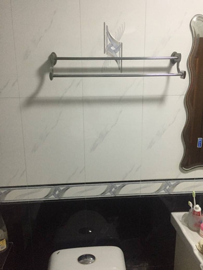 这位业主表示,他家的浴巾架正好安装在马桶的上方 平时冲厕所不盖马桶盖,不知道会有会有影响 ! l( }0 O) D: T3 w) Y5 S7 J$ y q