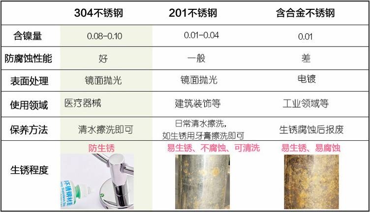 9 [& \$ E' L. D5 r! `有些不怎么上心的业主啊,只听商家一说是不锈钢的,看着也差不多就定了,但是不锈钢可不一定真的不生锈喔,先来看看下面这个对比表。 4 L$ H: |+ T" R1 A7 I