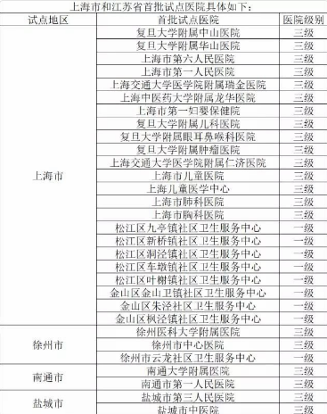 目前上海第一批试点的医疗机构有 23 家,包括 15 家的三级医疗机构和 8 家社区卫生服务中心。我省试点医疗机构南通 2 家、盐城 2 家和徐州 3 家,一共是 7 家。