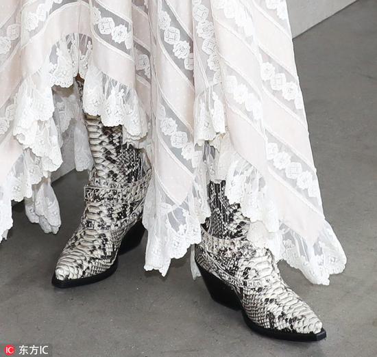 2。短靴+裙装——可仙可MAN,另类优雅 蛇皮短靴本就充满异域神秘的气息,一条风情的印花长裙既中和了蛇纹的野性,又多了一份法式的浪漫。