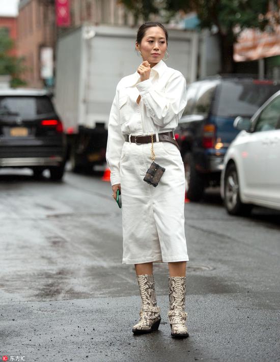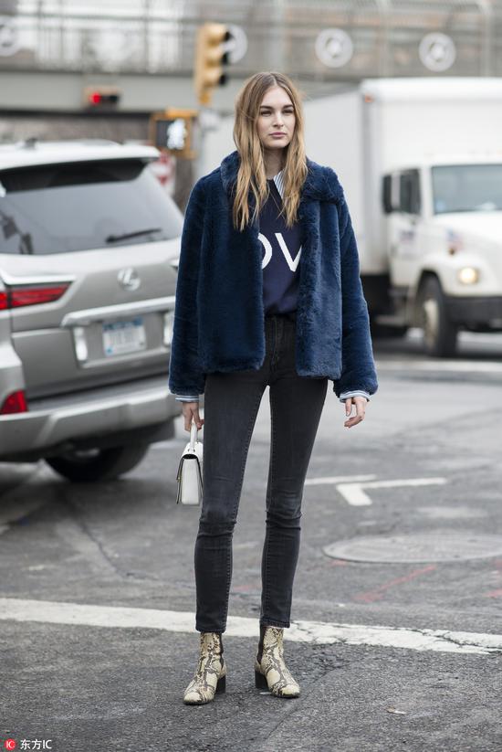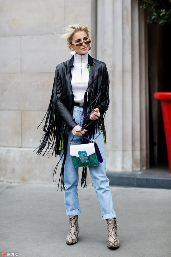 蛇皮短靴搭配紧身牛仔裤是我们在街拍中最常看见的一种搭配,夸张的蛇纹并不会影响牛仔裤展示你的大长腿。丹宁真的与蛇纹靴有着默契的化学反应,再加上一件皮衣外套就能立刻拗造型有没有!