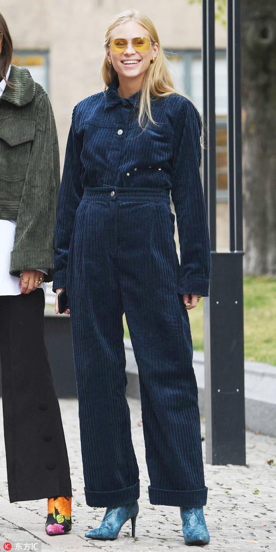 纯色的连体装也是蛇纹短靴的绝配,一个夸张一个简约,一个干练一个野性,如果连体装是宽裤腿就不妨挽起裤脚,营造一种随性潇洒的帅气。