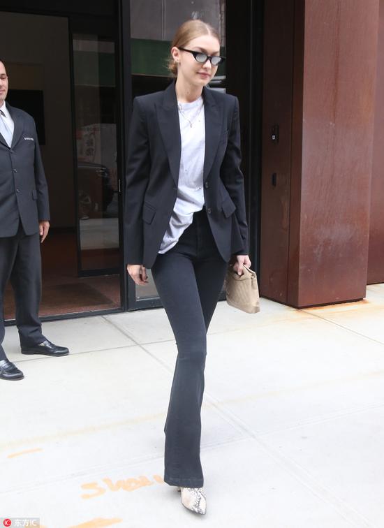 Gigi穿上蛇纹靴,可以说与她的气势非常搭了,配上垫肩西装外套和飞行员墨镜,充满了野性酷感的气息。