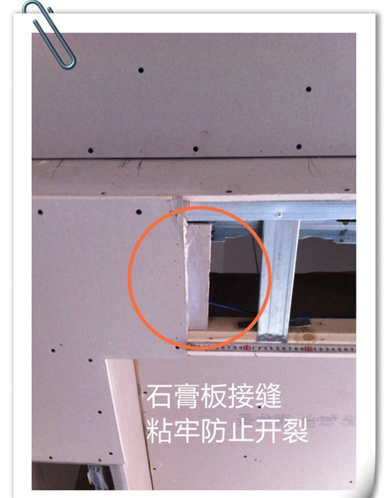 ( z# Q* n5 h9 y* x+ P& I3、石膏板接缝处要在背面刷木胶,再贴石膏板,把缝隙遮住。俗称“底包天”。1 b3 A1 q& D3 J( }! L1 z