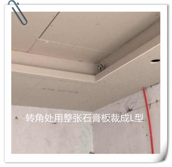 2、转角拼接处使用5厘板打底,或叠层石膏板挖L字型再拼接。因为转角是最容易开裂的地方,L字形就能解决这个问题。