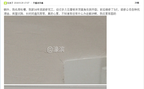 最后,对于我们吐槽的网友家中吊顶开裂的情况,蜗牛想说,想要对症下药,必须先找到问题出在哪里,开裂只是表面现象,里面如何还是要把腻子铲开来看看才知道,不然没有找准关键,即使修复了表面,问题也依然是存在的。其次,对于装修公司推托责任的问题,需要好好商议,彼此寻求一个解决办法,如果不予解决,可以投诉维权处理。