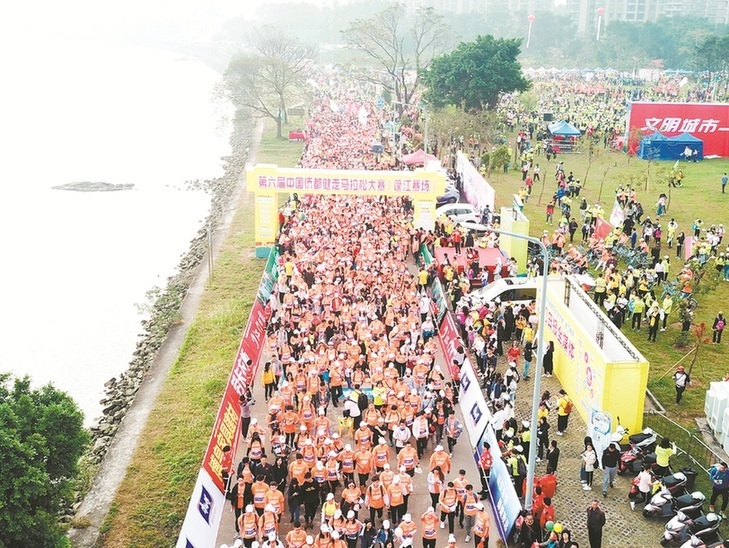 “江马”蓬江赛场,参赛选手像一条长龙,蜿蜒在滨江绿道上。 刘琼 摄 “啪——”随着发令声响,昨天(11月24日)上午9时,“锦富·汇景湾”第六届中国侨都健走马拉松大赛蓬江赛场正式开赛,5000名参加全程健走马拉松赛程的选手率先“启航”,迎着朝阳走向滨江绿道。高新(江海)、新会、台山、开平、鹤山、恩平等6个赛场的健走马拉松赛事也相继启动。一时间,近10万人同时行走在五邑大地上,用行走的力量,绘就了一幅幅欢乐、温情、文明、感人的画卷。 本届“江马”举行得十分顺利,秩序井然有序,参赛选手们全程按照规则和指示参赛,志愿者、交警、医护人员等均各司其职,维护现场秩序,保护选手安全,使得大赛有风度更有温度,体现了本届大赛的主题——“文明城市与爱同行”。 “江马”逐步走向成熟 “江马”已经走进第六个年头,早已成为这座城市的名片和标签。家住滨江新区的黄光明已是第四次参加“江马”,对他来说,每年的“江马”都有新的体验和收获。 据了解,本次蓬江赛场共有2.5万人参赛,比赛从上午9点开始,到下午,选手们陆陆续续回到终点。健步走广场(起点)到全程折返点沿途设有10个节点,有补给点、医疗点等,还设置了丰富多彩的表演节目与选手互动。 高新(江海)将赛场设在白水带风景区,途中设置5个表演点,邀请花样跆拳道、爵士鼓、动感啦啦操及传统醒狮团队助阵;新会赛场设圭峰、崖门两个比赛区域,圭峰区域路段风景优美,满眼苍翠,沿途设立3个医疗点、5个给水点,还安排了歌舞等特色表演节目为选手加油鼓劲;台山台城南区赛场沿途规划了“全域旅游”展示点,17个镇(街)现场展示自身特色旅游资源,让参赛选手欣赏台山的美丽风景、特色美食;开平赛场则围绕宣传“创文”和健走健康的主题,举行了装扮表演和街头艺术表演等群众喜闻乐见的文化活动;鹤山赛场引入了“ColorRun”(彩虹跑)活动元素;恩平超7000人参赛,赛场出发点设在了恩平市体育中心。 爱心浇灌出文明之花 去年以来,我市为恢复“全国文明城市”荣誉称号做了诸多努力,市容市貌的整治、城市品质的提升、市民文明素质的宣传和培养……经过多重努力,今年我市终于复牌成功。在昨日(11月24日)的“江马”赛场上,近10万市民再一次用实际行动证明了我市精神文明建设的成果。 在蓬江赛场,记者看到,“垃圾不落地共建文明城”的标语随处可见,选手们在比赛的过程中,大多携带环保袋,将自己用过的包装纸、塑料瓶自觉地装好,数万人停留过的健步走广场上,见不到一片垃圾。 本届大赛,“与爱同行”是其中的一大主题,为此,大赛特别增设了“慈善任我行”活动,邀请企业在参赛者完成相应赛程捐出相应数额的善款。同时,比赛现场还设置了“随手捐”摊位,鼓励市民参与慈善捐款。在迷你赛程中,还有一个由150人组成的慈善方阵,余松胜就是其中一员,他告诉记者,自己是无限极的一名员工,平时经常参与蓬江区慈善会举办一些志愿活动,“现在做慈善已经不仅仅是有钱人的专项了,我们普通老百姓,虽然不能捐出大笔钱财,如果想做,仍然可以通过参加志愿活动贡献自己的力量。” (江门日报记者 傅雅蓉)