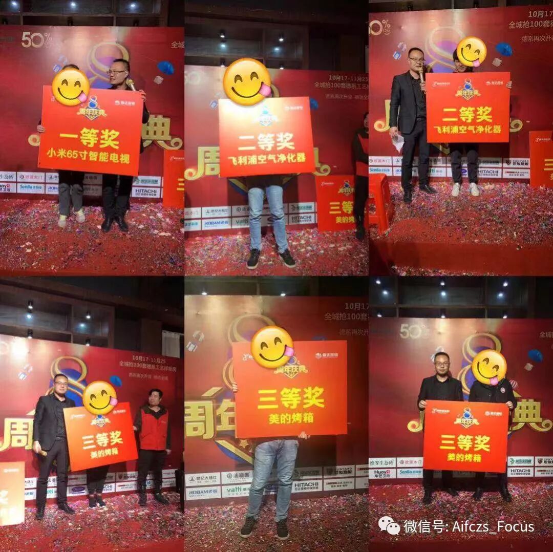 8 s# _ X- ]8 S' `0 f! a2 j在周年庆活动现场,爱蜂潮装饰用感恩的心,让利给客户,除了到店就送精美的礼品外、签单砸金蛋赢电视机、科勒马桶、智能机器人、双开门冰箱等大奖更是将周年庆典热情推向高潮!获奖业主上台领奖!