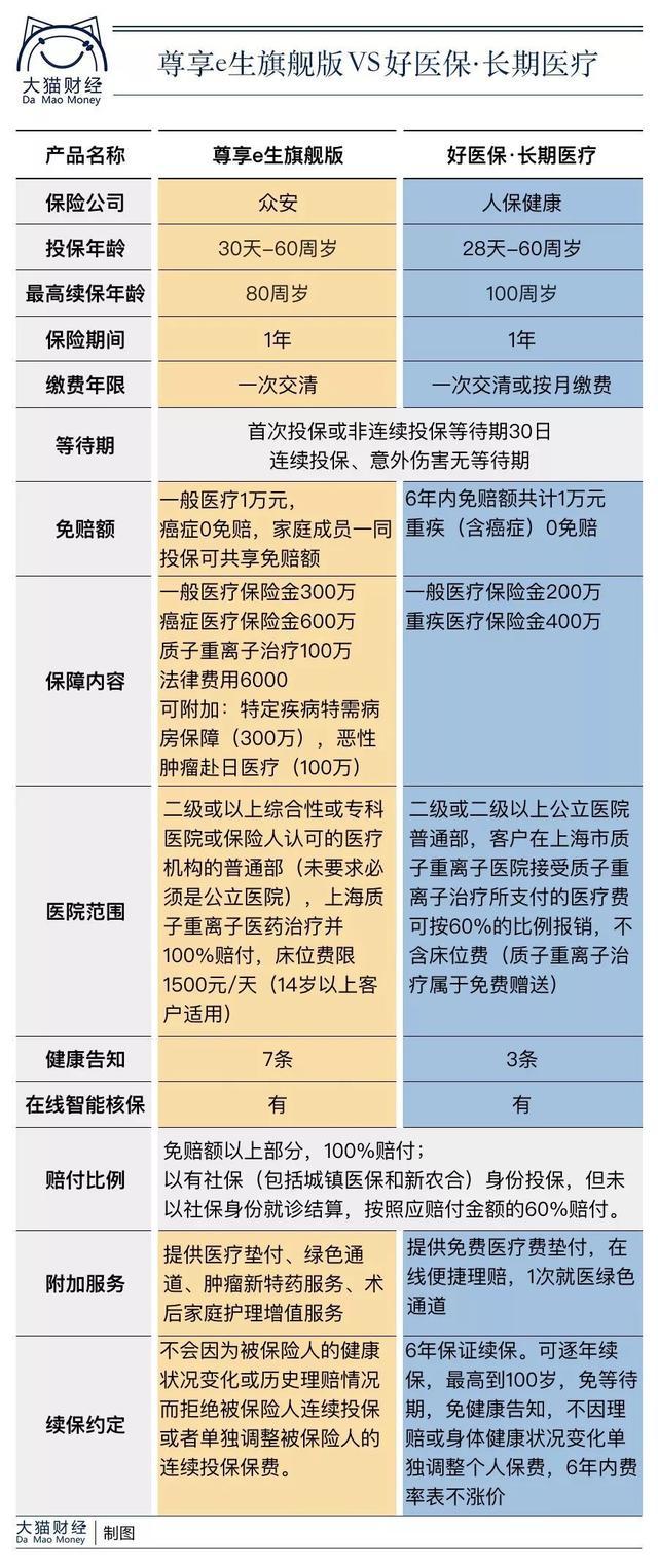 最近有两条新闻: 在成都锦江区某小区,有一位65岁的老人坠楼,后警方发布信息,坠楼者系自杀,当时她已癌症晚期。 有一位女儿晒出自己父亲的住院账单,61天、104万,这之前的住院费用也有几十万。这位老人是因为急性心梗,抢救手术后转入了ICU重症监护病房的,虽然医院也在极力的节省费用开支,但是最后的数额依旧很庞大。 不管是老年人灌下的养生鸡汤、中年人伤不起的“流感”、还是青年人热衷的夜跑,都绕不过“健康”二字。 除了珍惜健康,我们还能做点什么?那就只能是努力攒钱攒资产吧?比如那张104万的住院收据上,明明白白的写着“预收924000(信用卡:924000)”。如果你有能一笔刷带这么多个0的信用卡也行,要不,就借助保险之力吧,百万医疗险是目前应对灾难性医疗费用最好用的保险,不但能就患者的命,也能就一个家庭的经济生命。 01 不吹不黑 客观看百万医疗险 一年几百块钱,撬动百万医疗费用保障,这样的百万医疗保险对保险公司、对买保险的人来说,目前是个双赢的选择。 对于买保险的人来说,最担心的、最可能负担不起的,不是几百块、几千块,甚至几万块可能东拼西凑也能负担,最难以承受的,是几十万、几百万的大额医疗费用。回想一下,大家对中年“流感”的共鸣,也是发自内心最无奈的感叹。 百万医疗险可以提供一年几百万的保障,而且不限于社保报销范围,像是进口药、靶向药、自费药都可以报销,保障面覆盖特殊门诊、手术费用、护理费、检查费、治疗费等,像是价格高的吓人的ICU病房也在保障范围内。在灾难性医疗事件降临时,真的能解决不少问题。 对保险公司来说,百万医疗险也是摸着石头过河,目前大部分公司设定了自费部分1万元的免赔额,避免了高频的、小额医疗的赔付,才能给出这么低的价格,一年几百块钱,还是大部分人都能承担得起的。 而终身保证续保的医疗险是非常有风险的,因为医疗费用每年都在大约以10%的速度上涨,人口的老龄化问题、新的医疗技术出现等等,一旦保险公司精算不到位,都可能赔穿乃至破产。 猫妹认为,真正谨慎、负责的保险公司,不会盲目的开发超长期保证续保的产品,反而应该是努力把现在的产品做好、做长久。监管对长期保证续保的医疗险的态度,大致可以从某10年保证续保的产品的被紧急喊停看出来。 所以,对百万医疗险,大家一定要客观理性——花多少钱办多大事儿。 千万记住,商业保险是社保的有益补充,解决一些社保不能覆盖的问题。但有些是带着国家福利性质、无数人每年交几千、几万的才能办到的事儿,也别强求商业保险必须办到。 02 各种百万医疗险该选谁? 经常有猫友、亲朋好友拿着各种百万医疗险问,这个如何,那个咋样。 目前很多保险公司都在销售百万医疗险,有的甚至在不同渠道还投放不同的产品。保守说,三四十款也是有的。单单看产品,说实话,大同小异,俗话说天下文章一大抄,在保险这儿也适用。 那就能闭着眼睛选吗?也不是。 猫妹认为,选百万医疗险,要选销量足够大的,因为只有销量足够大,大数法则才起作用。不会因为一些小波折,就赔穿、停售。 而产品和产品之间,客户群的分布也不同,比如在互联网上买保险的,基本上还是年轻人居多,不同年龄的人群发病率是不同的,这点无法否认。 还有,要选公司努力经营的,有些公司把百万医疗险看的很重要,一直在投入力量想做得更好,有些公司就是跟随策略,“代理人出去展业需要这样的敲门砖,那咱家也来一块”。公司付出的心血不一样,最后的结果也许也会不一样。 至于是不是大公司的才有保障理赔更好,猫妹还是那句话,没有数据支撑,那就不要随便下判断,要不然容易交智商税。 03 给绝大多数人的推荐 如果你想给自己买百万医疗险,目前比较推荐的是“尊享e生旗舰版”和“好医保·长期医疗”。 1、尊享e生旗舰版 尊享e生是众安的“作品”,说它是“作品”而不是“产品”,是因为3年时间,它居然已经升级12次了,这速度,非常的互联网。而且众安的每次升级迭代都很吸引眼球,可以说,在带着行业的节奏走。 尊享e生的销量也很争气,一家公司没有代理人队伍,也没有自己的流量平台,在网上销售全靠口碑,已经很惊人了。 由于是网销,客户群体整体年轻化,目前尊享e生客户的年龄结构也还是非常的好,虽然是非多年期保证续保产品(这和众安拿的财险牌照有关,不能做一年期以上健康险),但3年了,发展势头依然不错,没有停售迹象。 可能是带着互联网基因的缘故,尊享e生的服务做的一直很好,在保障上,从质子重离子治疗保障,到特定疾病特需病房保障、恶性肿瘤赴日医疗,常有新鲜感,同时,公司也一直在服务上下功夫,比如院外购药服务、肿瘤新特药服务、免费靶向用药基因检测、术后家庭护理增值服务等等。就连它的健康告知都自带“翻译”功能,有些术语,你点一下就有解释,细节上还是很贴心的。 而且每一次升级之后,老客户在续保的时候都可以选择升级版(也可以续保老版),不用担心锁定了保障错过了升级。 至于理赔,猫友中已经有人体验过了小额在线理赔,速度还是很令人满意的《买保险容易理赔难?看完这些你就知道到底有多难了》。 2、好医保·长期医疗 好医保是支付宝的定制产品,合作的公司目前是人保健康。 支付宝的流量巨大,它“盖章”的定制产品整体来说还是挺不错的,议价能力也可圈可点。当