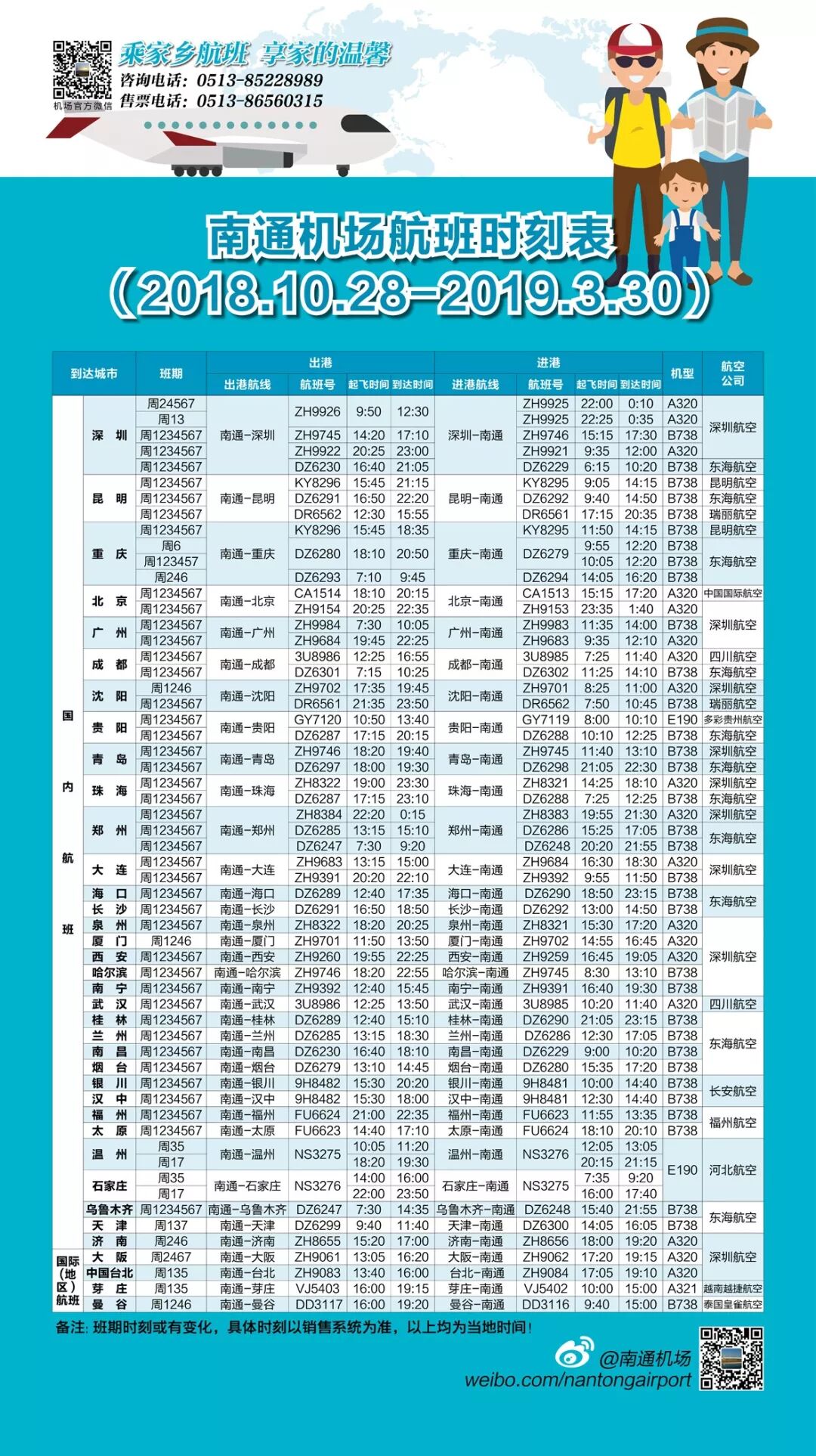 航班时刻:南通始发时刻7:30、13:15、22:20,详见航班时刻表。