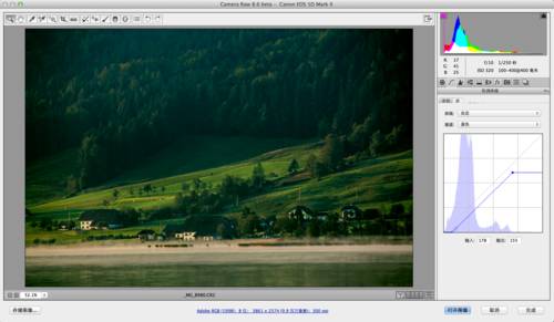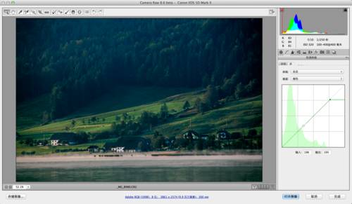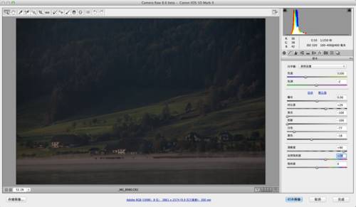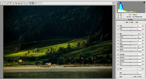这张风景拍摄于行使的大巴车上,可以从直方图中看到,亮部和暗部没有任何细节,画面显得很脏。如果按照常规步骤仅仅对画面进行对比度、清晰度、饱和度等的调整,你会发现画面没有明显改善。
