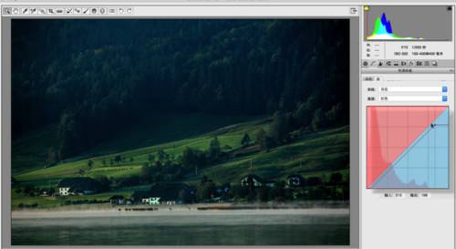 2、进入“色调曲线”面板,选择“点”模式,以便可以进入色彩通道进行调整。我们可以从这个界面中看到,斜线的意义就是代表亮度和对比度的变化。斜线上半部分代表亮部,下半部分代表暗部。但是,曲线调整并非随意拉动,而一定要结合直方图(画面中灰色峰值图)来调整。之后我们会看到画面有了明显变化。