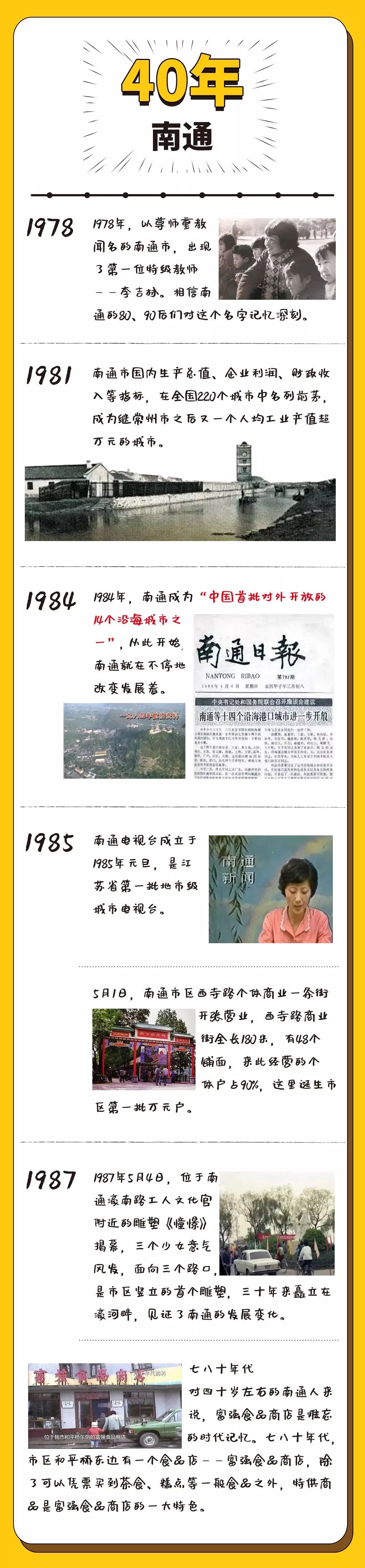 南通 从城市面貌到生活的点滴 都发生了翻天覆地的变化 人生一梦四十年,物是人非恍然间 这40余年来 有着那么一代人的童年时光 有着那么一代人的青春芳华 也有着那一代人的意气风发 有着,我们最深的怀念