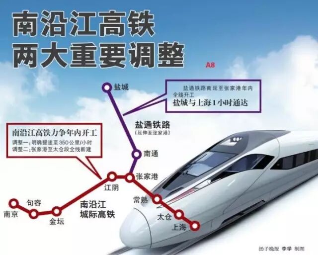而在中铁广州工程局制梁场另一侧,数十榀预制梁依次排开,220多名工人赶制浇筑箱梁,平均6小时可浇筑完成一榀。据了解,中铁广州工程局大丰制梁场去年9月28日正式进行箱梁浇筑,截至目前,已完成45榀。 盐通高铁二标指挥部副总工程师 王永贵:“为保证架梁工作顺利推进,我们梁场每天要确保3片箱梁的预制,进场的工人有220人左右,我们采取三班倒的作业模式,24小时作业。” 眼下,除中铁广州工程局外,其他施工单位也全力以赴、抢工会战,确保保质保量完成工程建设任务。截至目前,盐通铁路盐城段已完成桥梁桩基16640根;承台537个;墩身303个;已完成制梁240孔,箱梁架设工作已启动,目前已架设13孔箱梁。 盐通铁路全长156.6公里,时速350公里,也就是说从南通到盐城,时间缩短到半小时以内! 这条铁路建成后,可以让南通人乘着高铁,向北经这条铁路线进入徐宿盐淮铁路,进而通过京沪线抵达北京 也可经这条铁路线北上进入徐宿盐淮铁路后转入陇海线,抵达郑州、西安、兰州等中西部城市。 2017年6月,中设设计集团、铁四院联合发布“新建铁路苏南沿江铁路”首次环评公示。其中,苏南沿江铁路作出两大重要调整。 我省正在积极谋划南通至张家港高速铁路(通苏嘉城际铁路的一部分)的提前开工。这条铁路线路全长虽然只有约35公里,但是,建成之后却可以将盐通铁路与苏南沿江铁路衔接起来,从而使这两条铁路的效益最大化。届时,南通人可以乘坐高铁过沪通大桥,经张家港、常熟、太仓进入上海——沪通大桥有4条铁路线,2条为普速列车行驶线,2条为高速铁路行驶线。 迎来高铁时代, 一起为南通腾飞打CALL吧!