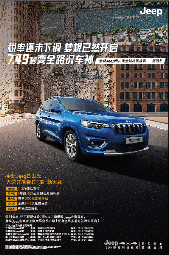 现在,有了全新Jeep自由光,带给你强大的安全感与舒适的驾乘体验 以上统统不用愁 “光哥”如何为你的生活保驾护航,到场体验才知道! 全新Jeep自由光全路况挑战赛,盛情邀您莅临! 2小时之内带你体验雨雪冰霜、南通的各种路况 不仅让你轻松闯关,更有好礼相送!