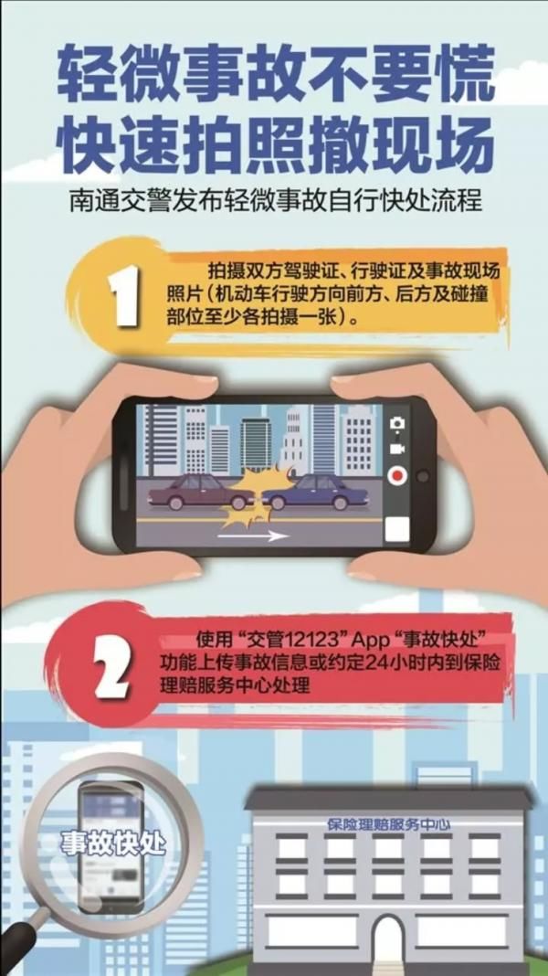 近日南通市公安局交警支队发布提醒,对轻微道路交通事故自行快速处理流程进行再提示,希望驾驶人遇到轻微交通事故后自行拍照、快撤事故现场恢复交通。 目前,南通市机动车保有量为199万辆,而2015年年底机动车保有量为100万辆,在三年多的时间里,机动车保有量就翻了一番,但在汽车给我们的出行带来便捷、舒适时,也因不自觉遵守交通法规引发交通事故,给自己或他人的带来人身伤害或财产损失,同时,也因交通事故导致交通拥堵或较长时间车多缓行的现象时常发生。 据不完全统计,车损事故在总交通事故量上占比较高,但目前的车损事故当事人能够自行快处占比较小,极少数人是自行拍照、快撤事故现场恢复交通,再一同自行到定损中心理赔;大多数车损事故当事人是通过打110报警,再由交警支队指挥中心接警员电话引导至到定损中心理赔。 分析原因,主要是许多的车损事故当事人不了解轻微道路交通事故快速处理要点,不自行快速处理事故,非得通过拨打110报警,有的甚至一定要待交警到达事故现场处理,延误了大量的时间,事故车辆也占用了大量的交通资源,引发了一次次交通堵塞或长时间缓行的不良现象,畅通有序也因此打了折扣。 如果发生轻微交通事故 按照《轻微道路交通事故自行快速处理指南》 这样处理更方便 01 处理流程 (一)当事人用手机拍摄双方驾驶证、行驶证及事故现场照片,在机动车行驶方向前方、后方以及碰撞部位至少各拍摄一张事故现场照片。照片要能够清晰辨别机动车号牌号码、道路标志标线。 (二)各方当即使用“交管12123”App中“事故快处”功能上传事故信息或约定在24小时内,到市区任一保险理赔服务中心处理。