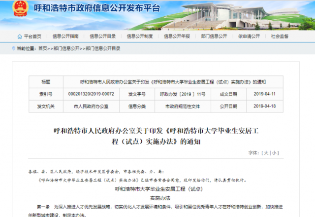 4月18日,内蒙古呼和浩特市人民政府办公室关于印发《呼和浩特市大学毕业生安居工程(试点)实施办法》的通知公开。其中提及,具有普通全日制本科及以上学历的应往届毕业生(往届3年及以内),可半价买房。