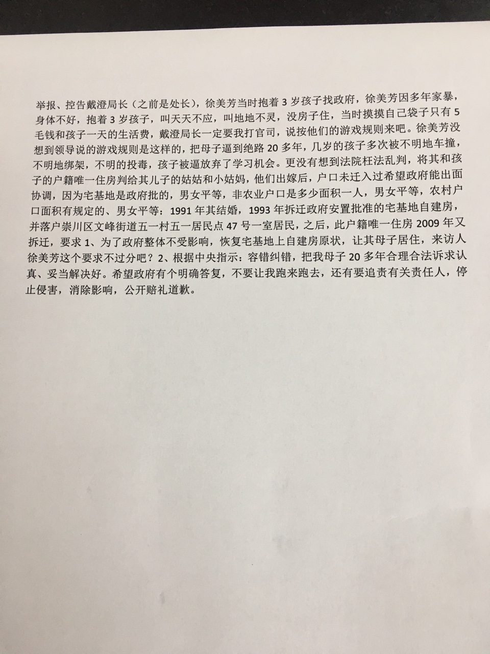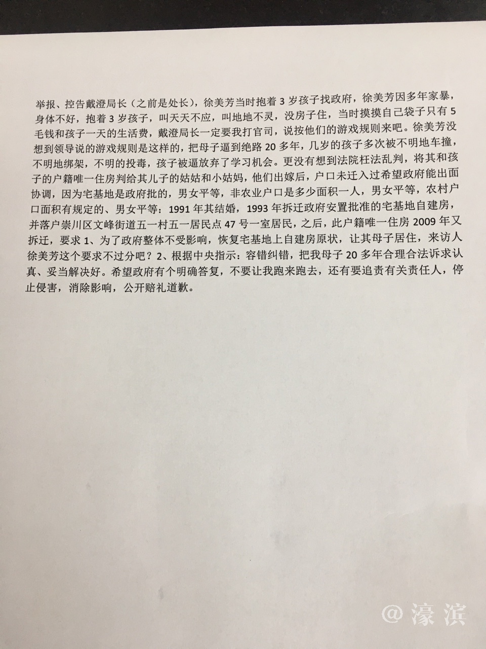 徐美芳要说法;妇女儿童的合法权益,仍何组织和个人都无权剥夺和侵犯。 |