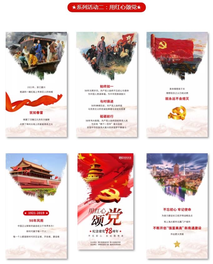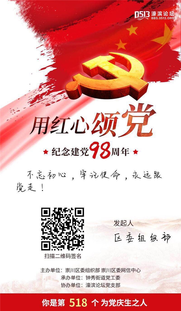 2019年是中国共产党建党98周年,为庆祝中国共产党建党98周年,讴歌党的丰功伟绩,进一步增强党员的使命感和责任感,为“不忘初心、牢记使命”主题教育活动营造氛围,由崇川区委组织部、崇川区委网信中心主办,钟秀街道党工委承办,濠滨论坛党支部协办的“不忘初心,永跟党走”线上活动正式推出。只需指尖轻轻一触,即可发布合影、留言寄语,为党的生日送上最诚挚的祝福。 参与主体:各级党支部 主要目的:通过与党旗、党徽等党建元素合影留念,展现支部党员风采,表达对党的热爱,抒发对党的感情,践行对党的承诺。