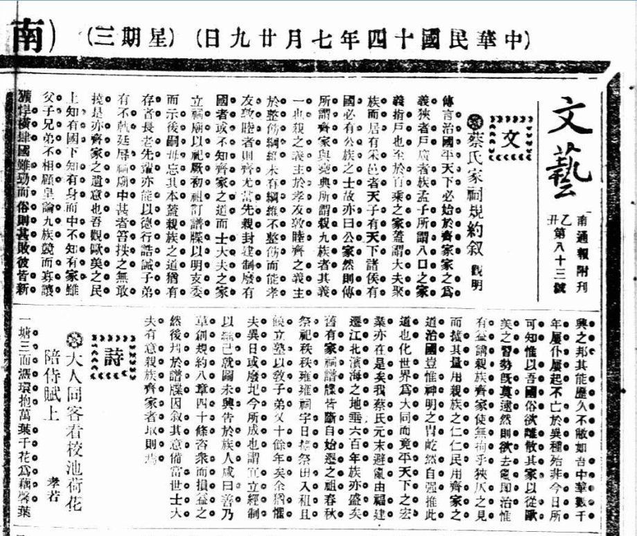 栟茶蔡氏家族有“家法”~1925年7月29日南通报纸刊载了栟茶大才子蔡观明为此作的序 |