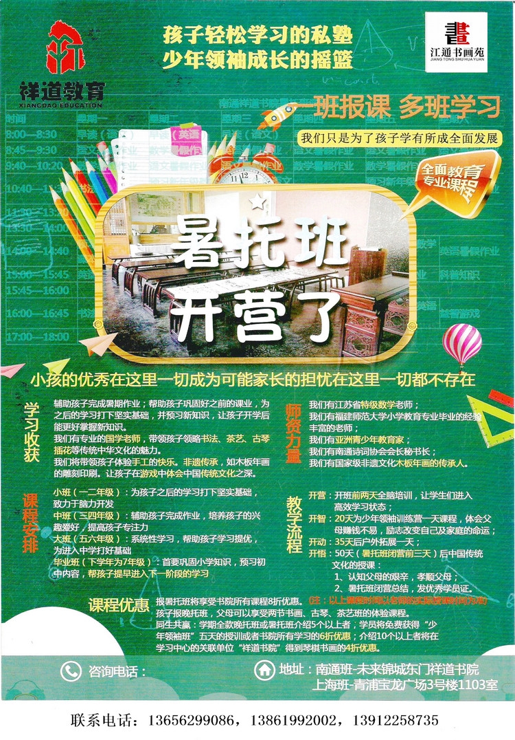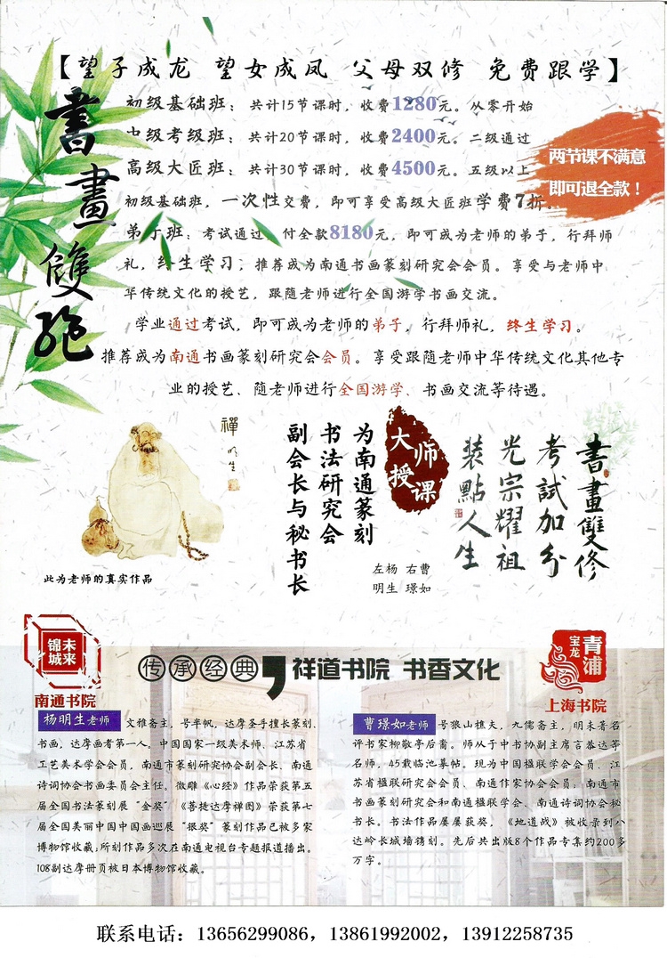 培训地址:南通市崇川区人民中路世伦路口未来锦城东门S3栋109室2楼,联系电话:13656299086曹老师13861992002杨老师13912258735吴经理,祥道书院祥道教育是经教育部门批准的正规书法教育机构。现开设有毛笔:楷书隶书启蒙、行书、篆书、草书及精品提高班、精品创作班、艺术特长班;特色精品班等。为南通书画艺术创研教育基地、崇川区江通书画苑创作基地、南通市楹联教育基地,,,高德地图、百度地图搜索 祥道书院