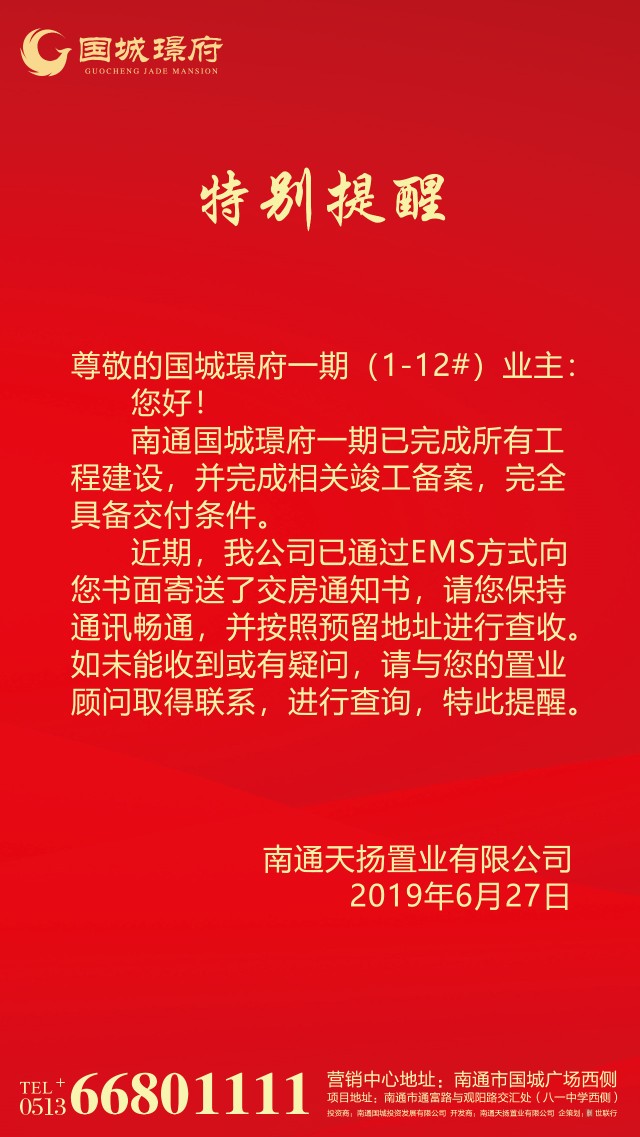 [焦点爆料] 南通神盘“国城璟府”确实牛,交房通知书也与众不同,竟然不盖单位公章。 |