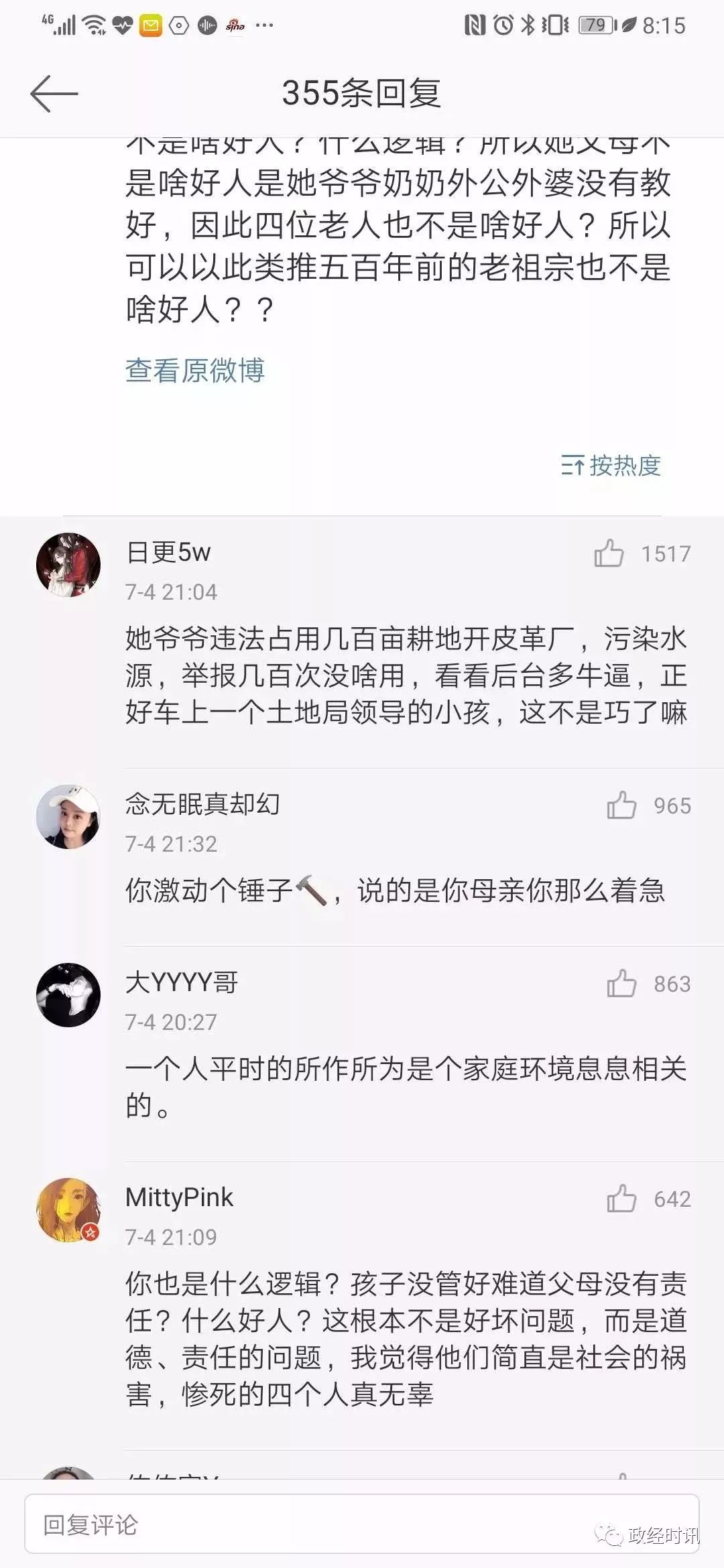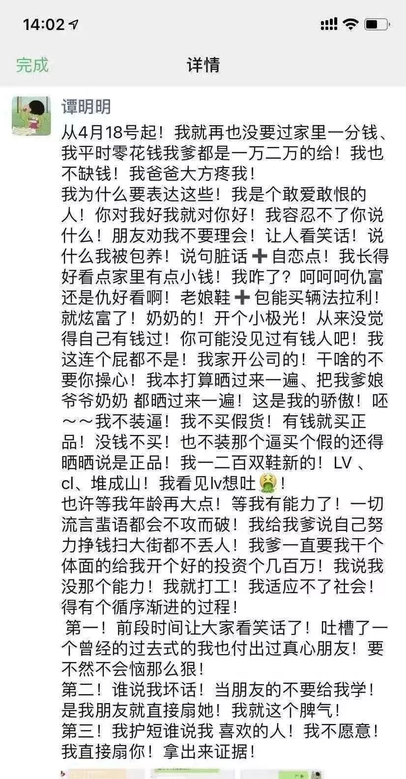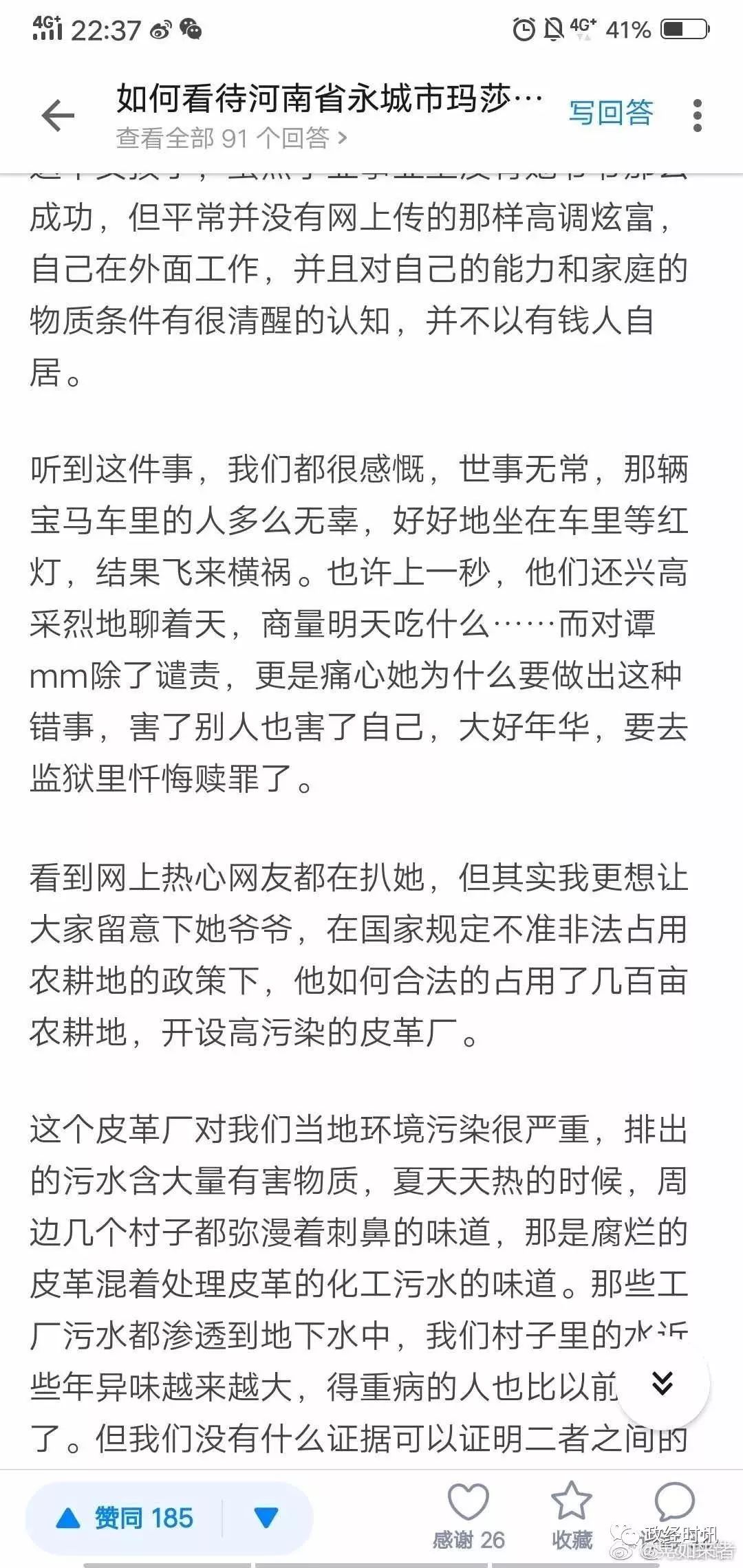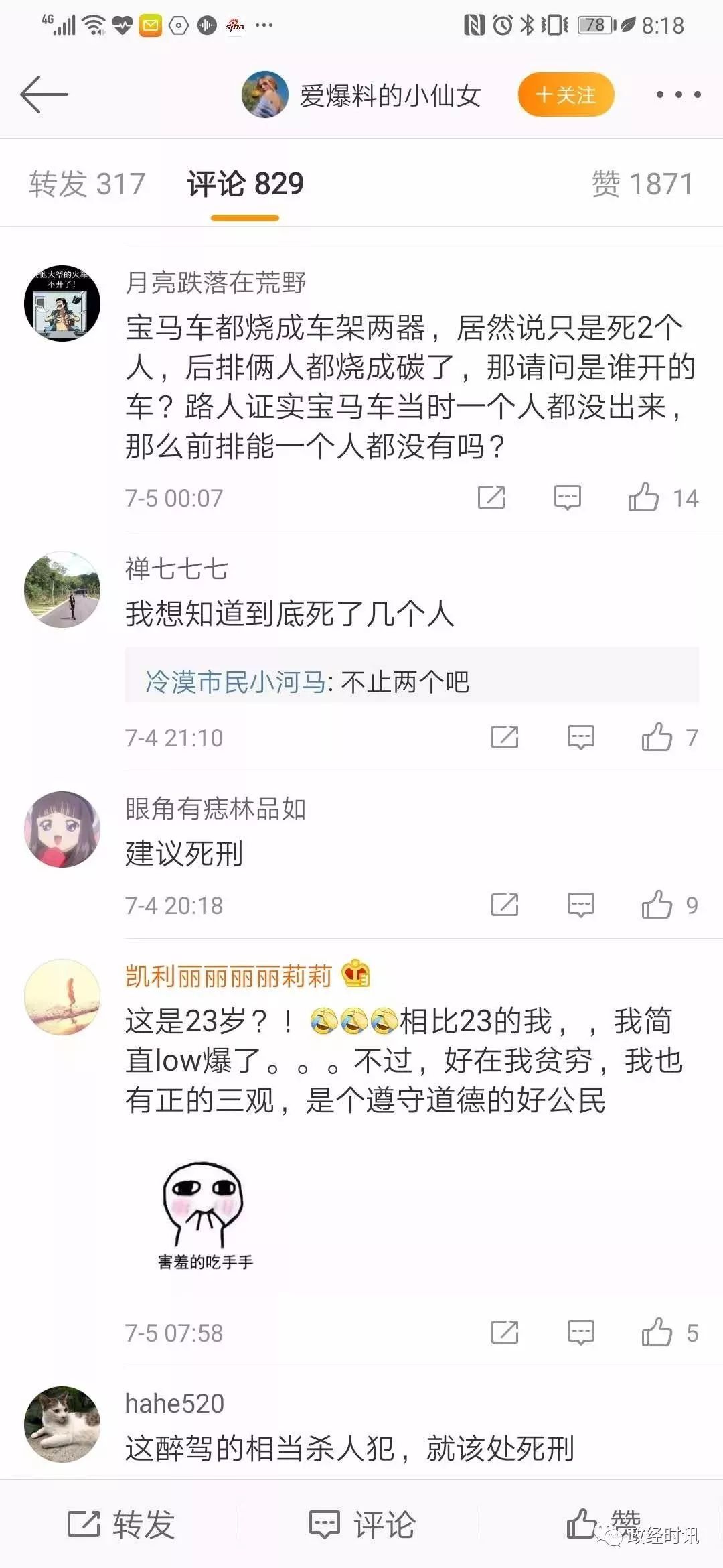 图文来源/政经时讯 永城惨烈车祸女主谭某某被扒皮,被指是当地一污染企业皮革厂家人。网民指认其家皮革厂为非法占地,常年污染环境,被举报多年无人问津。谭某某微博被扒,基本是各种炫富,超级多的奢侈品。车祸发生后,其乖张炫富被公众广泛抨击。 一说这个,就有人说仇富。仇什么富?古天乐有钱吧,谁仇恨他?但是像王振华和这个皮革厂老板的富,大家一定是要仇的!为什么呢,中国古代先贤就说过原因——为富不仁! 另送谭明明微博照片 女子醉驾玛莎拉蒂致2死4伤 其父是皮革商 车内3人身份曝光 永城市公安局表示,他们将严格依法办案,从快查处,维护法律尊严,维护公平正义,同时也希望广大网民朋友以官方发布信息为依据,不信谣、不造谣、不传谣,共同维护良好的网络生态秩序 7月4日晚8点左右,记者在赶往商丘永城途中浏览该微博发现,此账号多为炫富内容。但是,约1个小时之后,该微博不仅换了昵称,更是清空了所有微博。在微博清空前,记者注意到,就在事发前一天,也就是7月2日,该微博曾发文称,“万事有因有果。自己选择的因,就要承担果”。此条微博下的评论一度达到1000余条。 而几乎在同一时间,永城市公安局官方微博发布通报称,公安机关以涉嫌危害公共安全罪对谭某、张某、刘某采取刑事强制措施。 因此,有数位网友发文质疑称:警方通报中称事故发生当晚犯罪嫌疑人已经被当场控制,为什么她的微博在出事后被清空? 7月5日,记者拨打了永城市公安局电话,想对上述问题进行核实。对方提供了公安局宣传科电话,让记者向宣传科了解情况。但记者拨打宣传科电话十余次,一直处于掉线状态。后记者拨打永城市交警队电话了解情况,在得知记者身份之后,对方表示没有义务回答记者问题,让记者拨打110询问公安局相关部门。 肇事司机“富二代”身份是否属实?村民:在镇上算是数得着的 事故发生后,有网友对肇事玛莎拉蒂上三名嫌疑人身份进行了爆料,称司机谭某为永城市茴村镇一皮革厂老板的女儿,张某为当地土地局某领导的女儿,刘某为当地一家连锁超市老板的儿子。 5日上午,记者在东环路与永兴街交叉口采访时,有多为居民告诉记者,谭某之所以会经过此路段,是因为她要回位于永城市茴村镇的家,并称谭某的父亲是茴村镇有名的皮革商人。5日下午,记者驱车沿着东环路向北行驶,经淮海大道往东,来到了相距不足十公里的茴村镇。 在镇上,当记者问起是否有一名谭姓商人开的皮革厂时,“你从这条路一直往东走,走到头,看到一座5层小楼就是他家了。”村民王先生告诉记者,不过他们家可能没人,因为家里闺女刚出了事。 当记者询问是否是7月3日的车祸时,王先生给予了确认,称现在他们家的人不是在医院就是在市里。 “谭家做生意好多年了,谭家的厂子算是镇上最大的几家了。他们家条件不错,在我们镇上也算是数得着的了!”王先生说,镇子不大,出事那天晚上镇上就有不少人知道了,第二天就都知道了。在问及谭家的厂子是否对附近的耕地有污染时,王先生表示,他并没听说过有什么污染的情况。 记者又在镇上询问了数位村民发现,对谭家闺女撞车一事,他们都已经听说,但是对于谭家的家庭情况等均闭口不言。 顺着王先生的指引,记者来到了一处耸立着五层小楼的厂区。和周边几家皮革厂相比,谭家的厂子明显要大很多。五层小楼后面是几处长达数十米的厂房,有的厂房里面堆满了类似皮革的东西。而在五层小楼东边,是几处类似于住宅的房子。走近一看,房子周围不仅有花园、凉亭和池塘,还有专门的处所圈养着鹦鹉、鸽子以及数只孔雀。同时,记者发现,厂房四周,种满了玉米,且长势良好,未见任何网传的污染痕迹,同时也没有任何难闻气味。 附近皮革厂几名工作人员也向记者证实了,该处厂区确实是肇事者谭某家的厂子,称他们主要是收购牛皮、驴皮等皮革,然后加工成半成品进行出售,目前该厂区正在扩建装修中。当记者继续深入了解时,对方变得谨慎起来,纷纷拒绝了记者的进一步沟通。 除了谭某,针对网曝另外两名嫌疑人的身份,记者曾多次尝试联系当地相关部门核实,但都未果。永城市相关部门曾对媒体表示,尚未核实肇事车辆内人员家庭情况。 三名嫌疑人是否已被拘留?肇事司机目前在ICU病房内 在被警方控制后,肇事司机谭某的微博不仅换了昵称,更是清空了所有内容。有数位网友发文质疑称:警方通报中称犯罪嫌疑人已经当场控制,为什么她的微博在出事后被清空?三名嫌疑人现在是否已经被拘留? 在寻找当地相关部门答复未果后,记者经多方打听,了解到肇事者谭某目前可能正在当地某家医院接受救治。5日下午,记者来到该医院进行实地探访,发现医院院子里停了两辆警车,其他并没有任何异常。 该医院相关工作人员称,7月3日晚上撞车的司机目前正在医院ICU病房接受救治,无关人员无法进入探视,就算是医院的普通工作人员也无法进入。该工作人员同时称,今天已经有好几拨人前来询问该女子现状,ICU病房外应该会有很多人。随后记者来到该医院ICU病房外,果然无法进入,病房外也有近二三十人。 醉驾肇事逃逸致死女司机,恐面临最高刑事处罚:死刑 关于以危险方法危害公共安全罪,根据刑法第一百一十五条规定,这种罪名要处十年以上有期徒刑、无期徒刑或者死刑。律师分析称,在司法实践中,类似以危险方法危害公共安全罪有