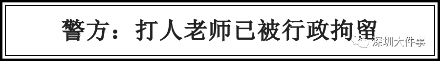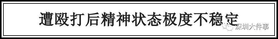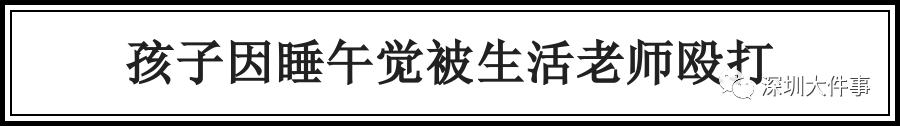 孩子好好的在幼儿园 但回家父母却突然发现 孩子脖子上多了一道疤痕 详细一问:竟然是老师打的! ▲孩子颈部的伤痕 到底发生了什么? 真的是老师打的吗? 冯女士的儿子小鸥在新保安幼儿园读大班。7月8日下午,冯女士下午下班回家后,看到小鸥的脖子上突然有一道伤疤。冯女士询问小鸥伤疤的由来,刚开始小鸥不愿讲。在反复询问下,小鸥终于开口。 据儿子讲,是班上的老师打了他 当冯女士想获知更详细的信息时,不知什么原因,儿子不愿再讲下去。 ▲孩子颈部的伤痕 从冯女士提供的照片中,南都记者注意到,小鸥的脖颈左侧偏上处有一道长长的紫色淤痕。冯女士告诉南都记者,得知儿子被打的消息后,她刚开始在幼儿园的家长群里反映相关问题,开始没人回应。后来,小鸥的班主任给冯女士打电话称,他们看了监控,小鸥没有被任何人打。班主任怀疑小鸥是自己不小心被刮伤的。 冯女士不相信班主任的说法 和班主任联系后,她又找到了幼儿园园长吴先生调取监控视频。冯女士介绍,当时,园长告诉她,监控闭路坏了,要过几天才能看。几天后,她多次和园方交涉后,才终于看到了完整的监控视频。 据冯女士提供的监控视频,2019年7月8日中午11时56分许,全班都在睡午觉。不知出于何种动机,一名女老师抓住了小鸥的双手后,对小鸥进行推、拉、拽、打,甚至还用脚踹小欧的头。 看到该视频后,冯女士感到震惊和痛心,“想不到他的老师对他这么残忍!” 冯女士表示,昨日小鸥刚刚去医院做检查,现在检查报告还没出来。但医生表示大体上没什么问题。但是小鸥的精神状态极度不稳定。冯女士发现,小鸥晚上睡熟后,有用双手乱抓、用脚踹乱提的行为。有时被人碰小鸥一下,他就会觉得有人打他。 冯女士 : 现在就害怕这事给他造成心理压力,会留下什么心理问题。 冯女士还告诉南都记者,类似的问题不止一次发生在儿子身上。原先小鸥告知他们被老师打时,作为家长,他们都是相信老师,觉得老师肯定是对的。 冯女士 : 孩子可能是被碰一下,就误以为有人打他,但是,没想到这次把孩子伤的这么重。 7月12日下午,南都记者来到新保安幼儿园了解此事。据该幼儿园园长吴先生介绍,打人的老师是幼儿园的生活老师,1986年出生,学历为中专水平。据园方了解,该老师当时看到小鸥一直不睡觉,想尽快哄他入睡。“所以就按住他,让他尽快睡觉。” 吴先生表示,事发后,园方立刻调取了监控视频。看到孩子被打后,他自己也感到很痛心和内疚。所以立即报警处理,绝不姑息老师的不当行为。 吴先生承认 该事件的发生是自身监管不到位所致的 下一步,他们将会跟家长积极沟通。园方现已经派人陪同家长去给孩子检查身体。园方也预约了儿童医院的老师对孩子进行心理辅导。同时,园方也举办了全员老师培训会,进一步提高老师们的教学素养。 吴先生表示,目前警方正在做进一步调查,最终调查结果出来后,园方将对社会各界公开调查结果。 就此事,今日下午7时许,深圳龙岗警方通报称,2019年7月10日21时许,龙岗警方接事主欧某斌报警,称其儿子欧某豪(6岁)被幼儿园保育员殴打。 龙岗警方表示,经调查,欧某豪系龙岗区园山街道一幼儿园学生,7月8日,其在幼儿园午睡时间段被班级保育员朱某春(女,32岁)殴打。经鉴定,欧某豪所受伤情为轻微伤。 龙岗警方介绍,目前,违法行为人朱某春(女,32岁)因殴打他人被公安机关处以行政拘留12日,并处罚款500元。