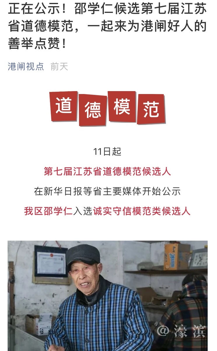 邵学仁候选第七届江苏省道德模范,一起来为港闸好人的善举点赞! |