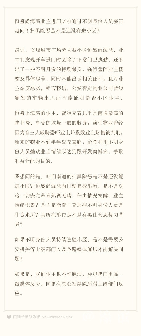 [焦点爆料] 恒盛尚海湾业主进门必须通过不明身份人员强行盘问!扫黑除恶是不是还没有进小区? |