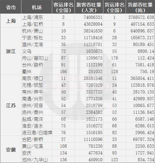 上海于南通空间结构示意图 图片来源:《上海市城市总体规划(2017-2035年)》 在中国区域经济学会副会长陈耀看来:“这个机场的建设,通过轨道交通+航空,打通了整个苏北到上海的通道,对于长三角北翼、东南东北地区发展都有好处。” 实际上,如果以长江划分长三角北翼和南翼,两翼之间一直存在区域发展不平衡。 北翼包括江苏苏中、苏北地区,如南通、扬州、泰州、连云港等;南翼则包括江苏苏南区域的南京、苏州、无锡,以及浙江杭州、宁波等明星城市。长期以来,北翼较南翼与上海联动更少,整体发展水平也更低,尚未有万亿城市诞生,离这一目标最近的南通,2018年GDP为8300亿元。 “南通是长三角北翼经济中心。”2016年,国务院办公厅公布的《关于批准南通市城市总体规划的通知》明确,“进一步加强与上海、泰州等周边城市以及苏南地区的协调合作,做好区域互联互通和江海联动”。 2017年,江苏省批复《南通建设上海大都市北翼门户城市总体方案》,南通顶着建设上海“北大门”的名头,在各路媒体上露脸,终于搏出几分存在感。 事实上,南通新机场规划研究相关专家组就曾表示:“建设南通新机场是长三角一体化加速推进背景下跨江融合发展的需要。” 如今,南通与上海正越走越近。除南通新机场外,据了解,近期印发的《长江三角洲区域一体化发展规划纲要》还明确提出,规划建设南通通州湾长江集装箱运输新出海口。这也是南通对接上海的又一重要看点。 一个真正的“江海门户”城市南通,已经跃然纸上。 大局考量 几家欢喜几家忧。南通的高调,预示着苏州的“机场梦”可能还得再等等。此前,城叔在《苏州到底需不需要一座机场?》中,就曾有过详细讨论。 建设机场这类大型交通设施,所需考虑的不仅是城市自身发展,更重要的是区域资源协调配置。而苏州与其20多公里外的苏南硕放机场之间的尴尬,正是涉及到这一问题。 苏南硕放机场虽由无锡、苏州共同出资,但由于相关壁垒尚未打通,机场对于GDP总量约3万亿的双城腹地服务作用尚未完全发挥。2018年,苏南硕放机场旅客吞吐量仅为721万人次。早在2018年初,江苏省委书记娄勤俭就表态,“做大做强硕放机场刻不容缓”。近日印发的《纲要》也提出,“支持苏南硕放机场建设区域性枢纽机场。” 在陈耀看来,“苏州想要建机场,不能只从苏州的利弊去考虑。一定要超越市域、省域思维,以长三角区域发展大格局来审慎规划。”“长三角区域发展”,就是机场布局背后那个需要通盘考虑的“大局”。 已经印发的《纲要》提出,长三角将编制实施长三角民航协同发展战略规划,要合力打造世界级机场群。这不仅需要核心城市具备极高的国际化程度,还需要整个地区形成极高的一体化水平。 在陈耀看来,世界级机场群总是与世界级城市群相伴而生。“世界级城市群必须要有高密度的交通网络,相较其他交通方式,航空网络更加快速、高效、便捷,是建设世界级城市群最重要的基础支撑。”陈耀说。 这样一来,长三角城市群的一体化建设,也需要在机场群一体化规划和建设方面有所体现。 城叔对长三角机场资源进行了统计,根据《2018年民航机场生产统计公报》,目前长三角城市群共有22个机场,总客运、货运吞吐量分别占全国19.6%、34.0%。
